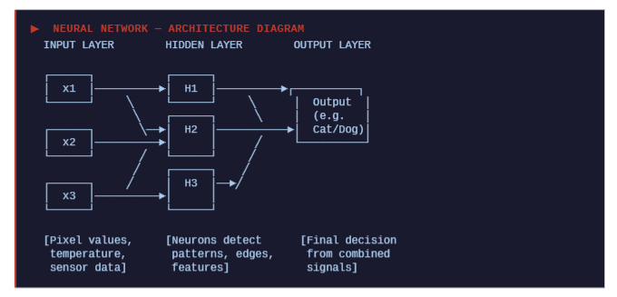 - How layers of neurons form a network — input → hidden → output